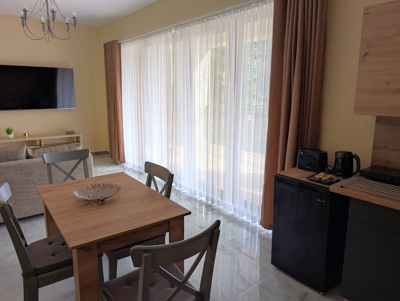 Aneks kuchenny wyposażony jest w zmywarkę, lodówkę, płytę kuchenną, komplet garnków, talerzy, sztućców, czajnik elektryczny, a także zestaw do parzenia kawy i herbaty. W każdym apartamencie znajduje się telewizor, pościel, ręczniki i zestaw kosmetyków w łazience. W całym obiekcie dostępne jest WiFi. Do każdego apartamentu przynależy miejsce parkingowe. Na dachu budynku znajduje się taras widokowy.